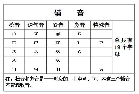 韩语是表音文字,一共有21个元音(也叫母音모음)和19个辅音(也叫子音자음),其中部分辅音还可以做收音。
